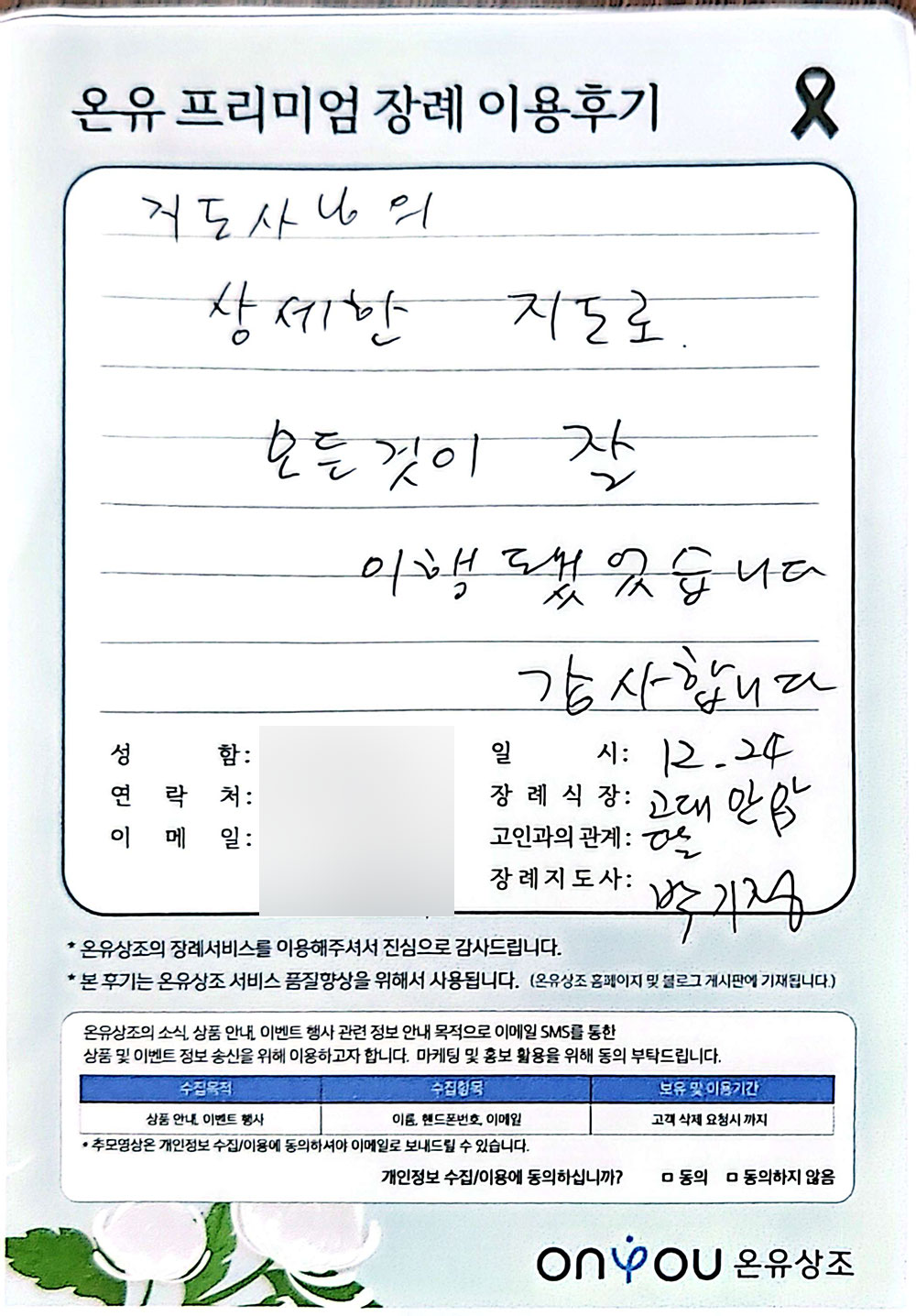 필수 수집 정보: 아이디, 이메일 주소, 계약자 이름, 계약자 주소, 계약자 연락처, 결제정보, 대상자 이름, 대상자 연락처