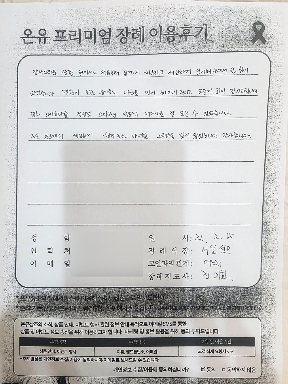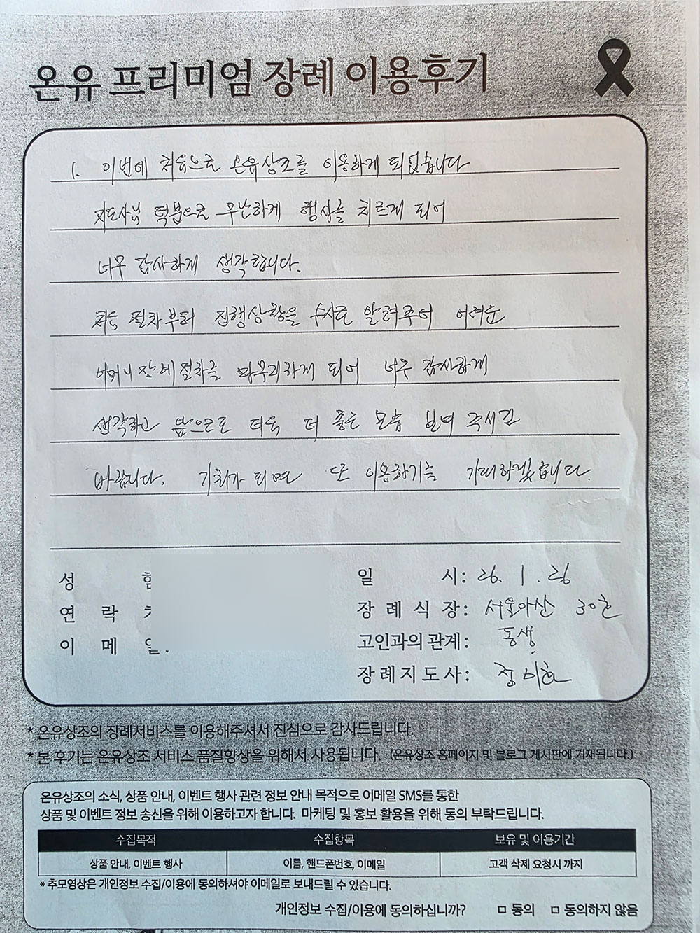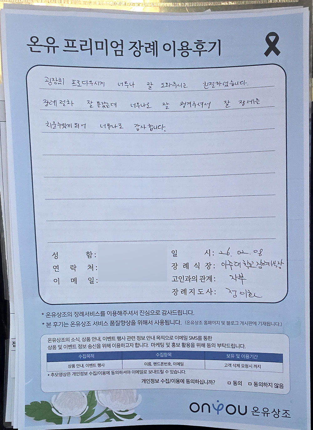 필수 수집 정보: 아이디, 이메일 주소, 계약자 이름, 계약자 주소, 계약자 연락처, 결제정보, 대상자 이름, 대상자 연락처