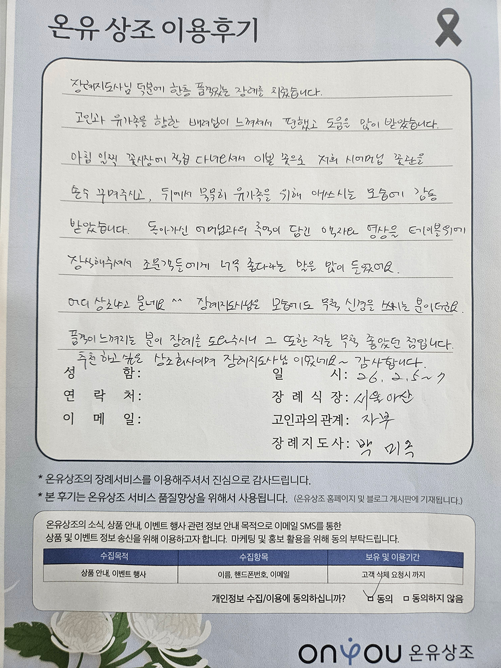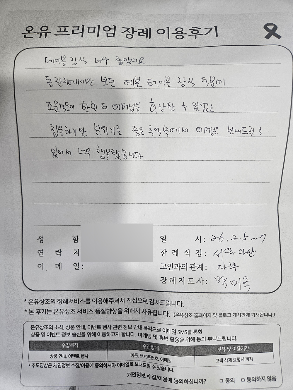 필수 수집 정보: 아이디, 이메일 주소, 계약자 이름, 계약자 주소, 계약자 연락처, 결제정보, 대상자 이름, 대상자 연락처