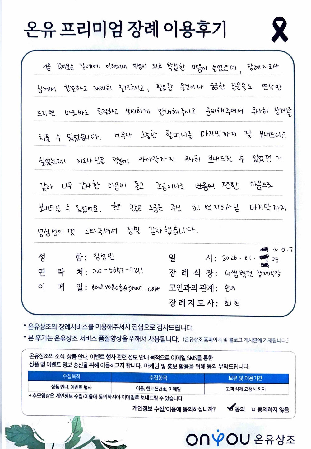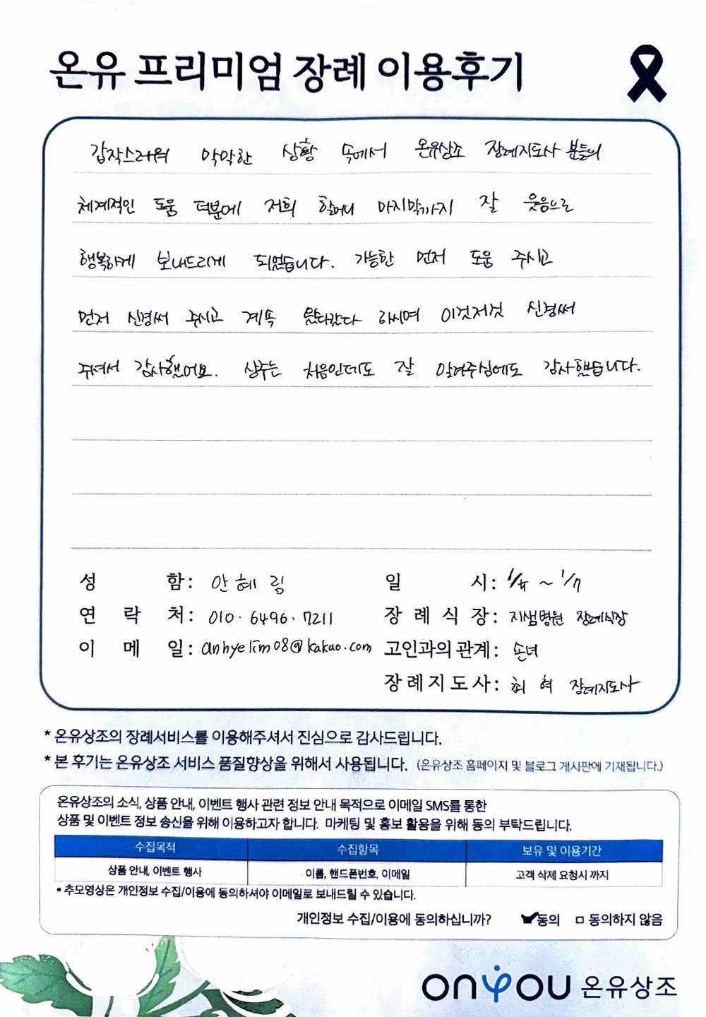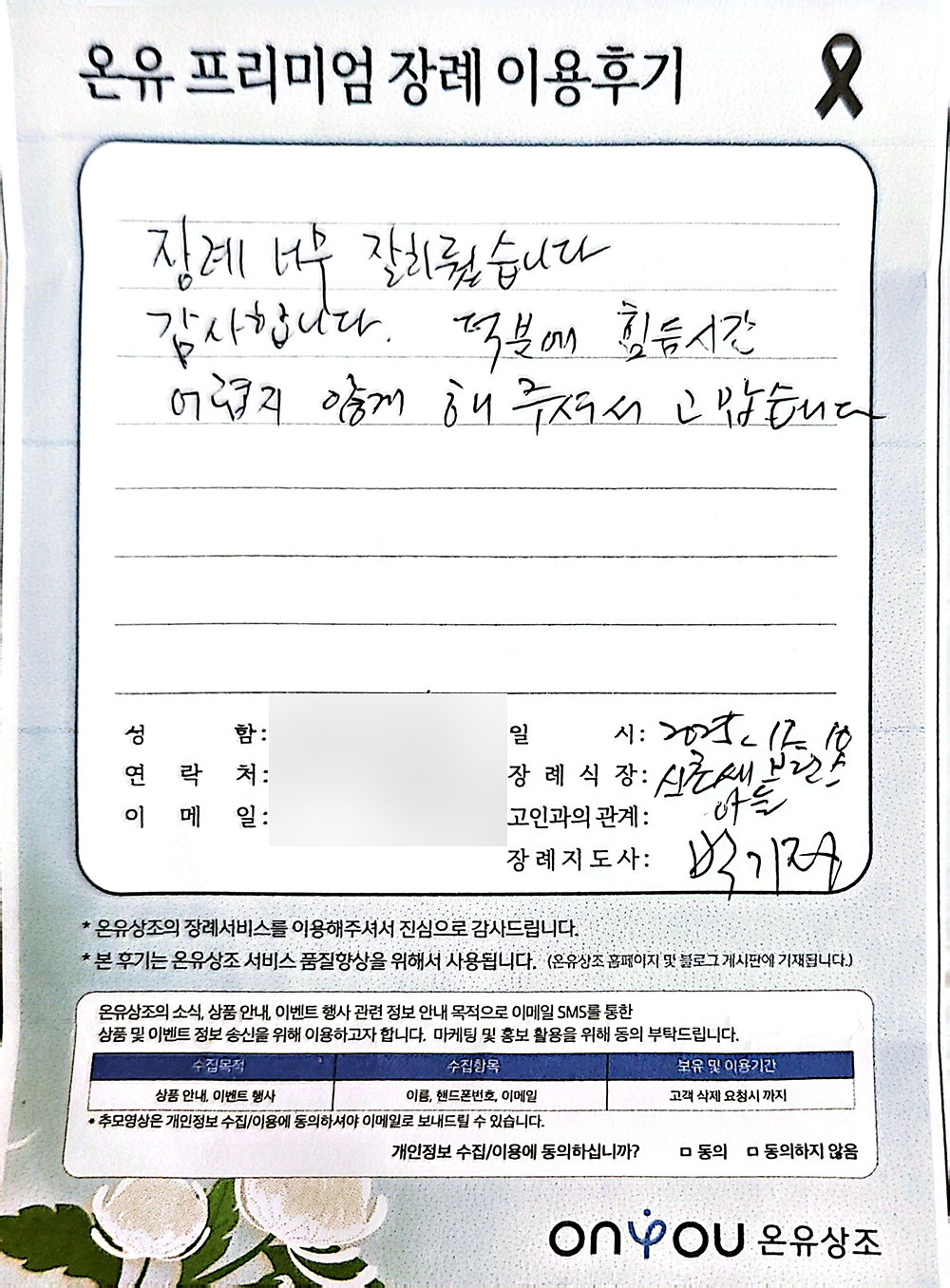 필수 수집 정보: 아이디, 이메일 주소, 계약자 이름, 계약자 주소, 계약자 연락처, 결제정보, 대상자 이름, 대상자 연락처